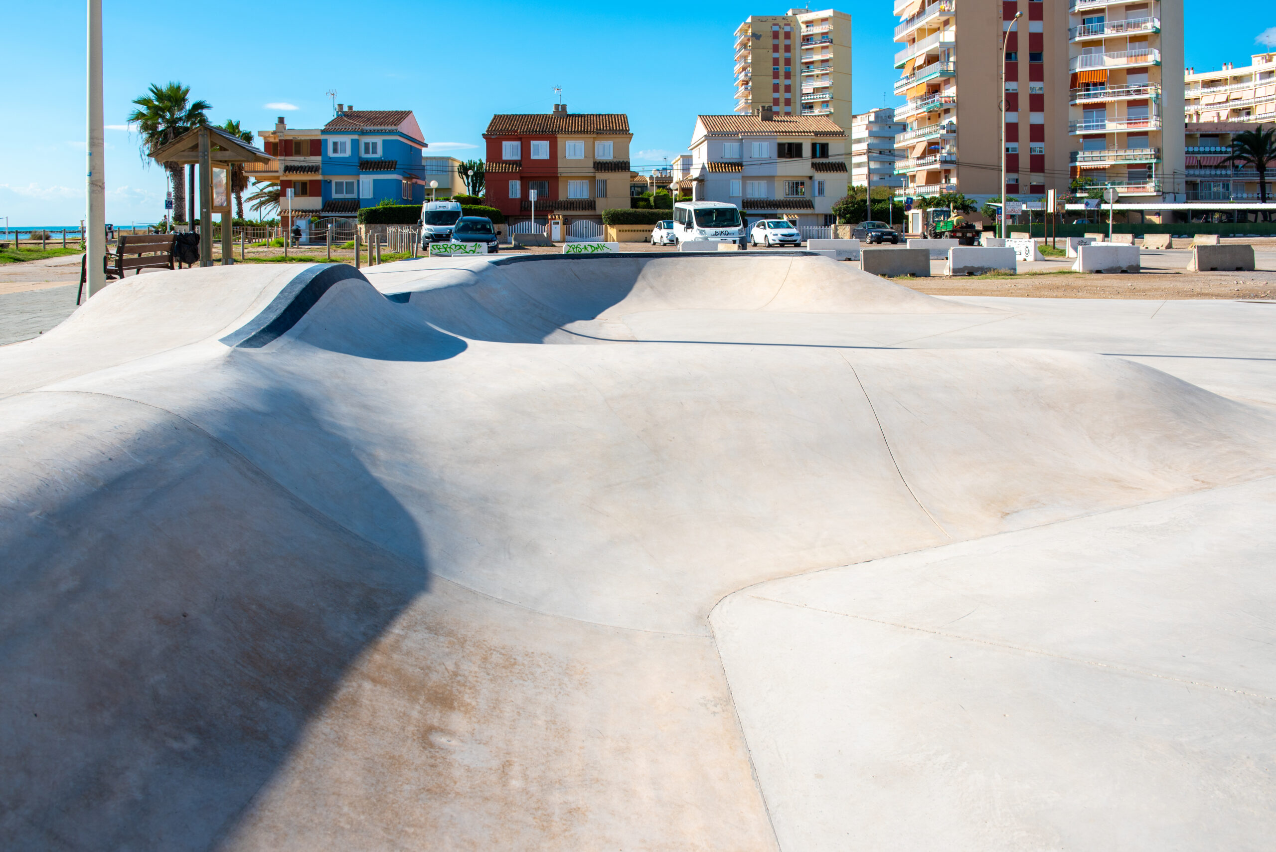 Skatepark de nivel de dificultad bajo-medio, junto al paseo marítimo de El Puig, zona playa.