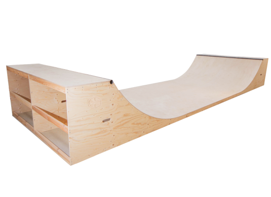 Diviértete con este HALF PIPE, diseñado con dos rampas curvas enfrentadas y conectadas mediante un tramo central. Dicho tramo central está dimensionado para adquirir velocidad y poder maniobrar en sus “quarters”. Ocupa una superficie aproximada en planta de 2,4 m de ancho por 7,5 m de largo y está construida en madera contrachapada de alta calidad. Tanto su superficie deslizante curva, compuesta de dos capas de madera contrachapada, como su tramo recto, tienen un grosor de 15 mm, lo que la hace extremadamente duradera. Este modelo también está provisto de dos copings en sus encuentros con las mesetas y está concebida teniendo en cuenta la dureza de sesiones intensas de práctica de este deporte.